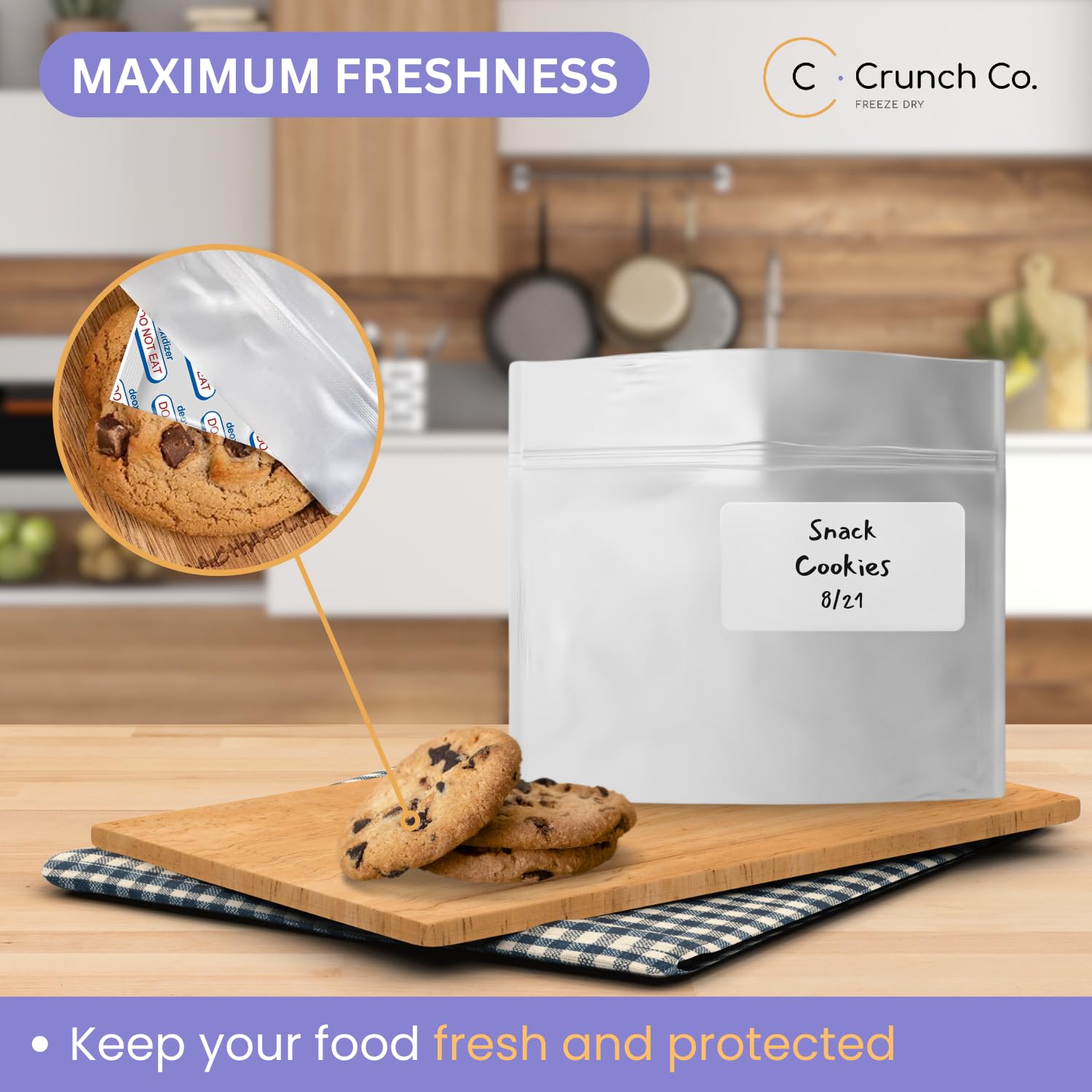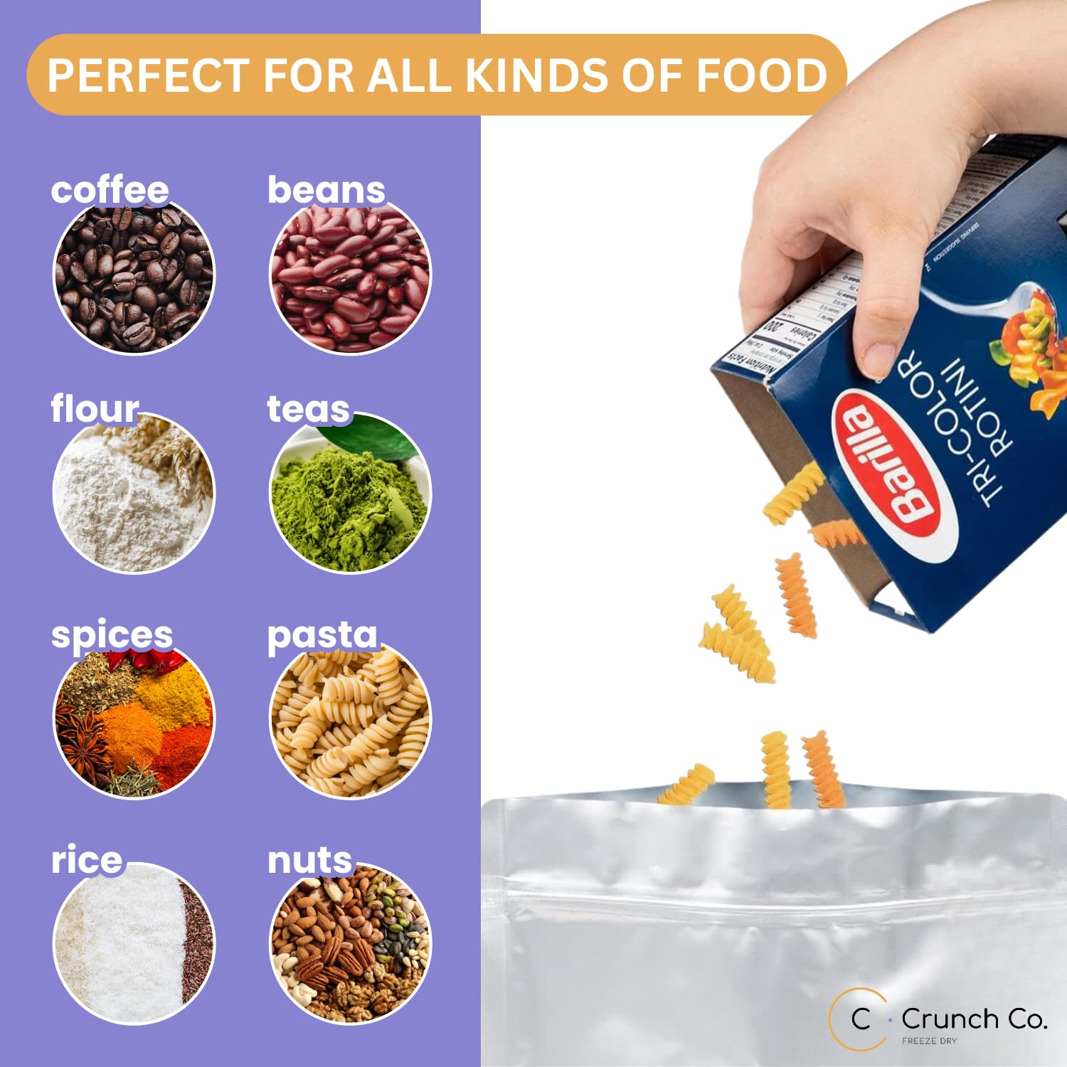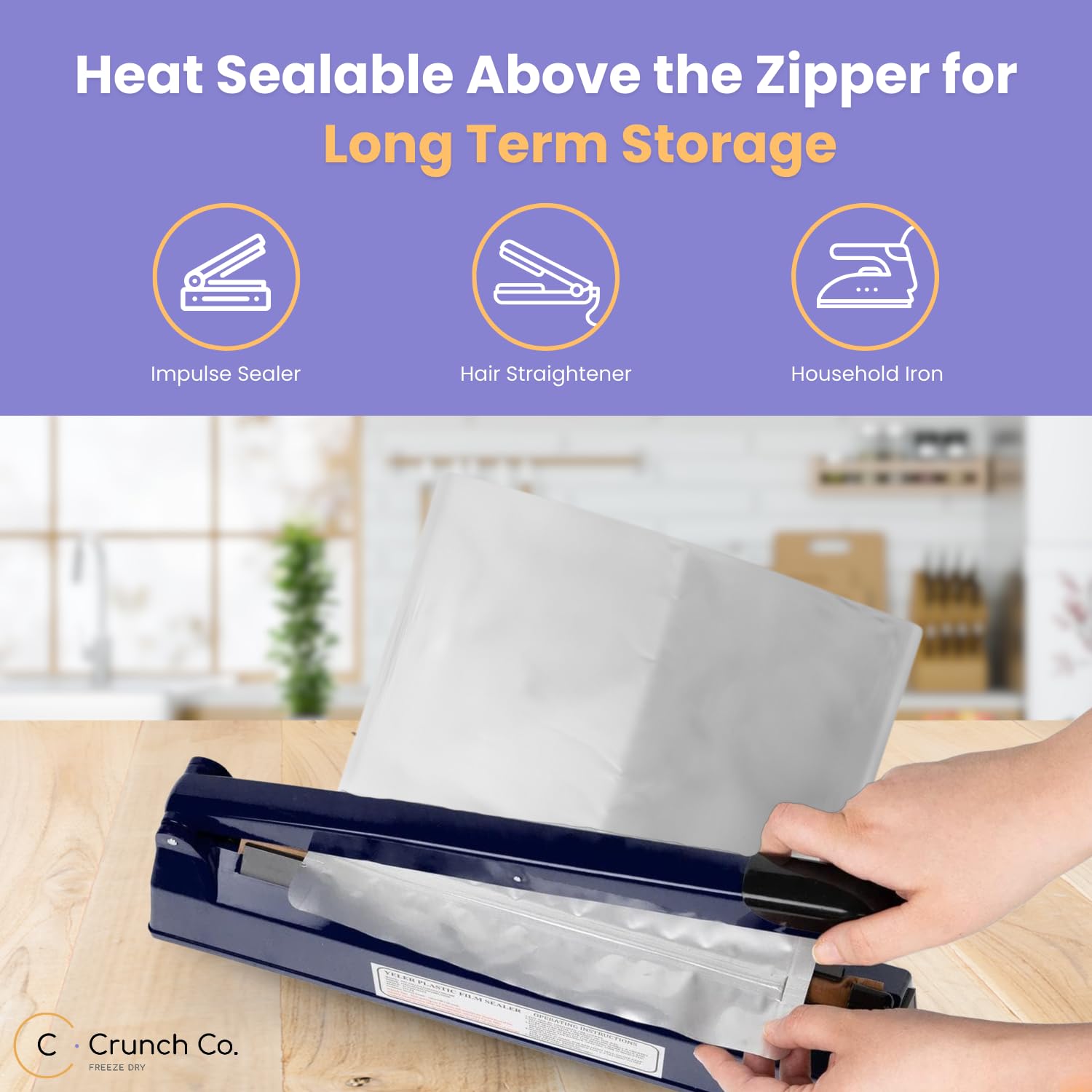 - MAXIMUM PROTECTION FOR FRESHNESS - Our Crunch Co Freeze Dry Mylar bags feature an additional internal layer of aluminum for superior durability and puncture resistance. This ensures that air and moisture are kept out, keeping your food inside fresh for longer. The BPA-free, food-grade Mylar is heat sealable above the zipper to create an airtight seal.