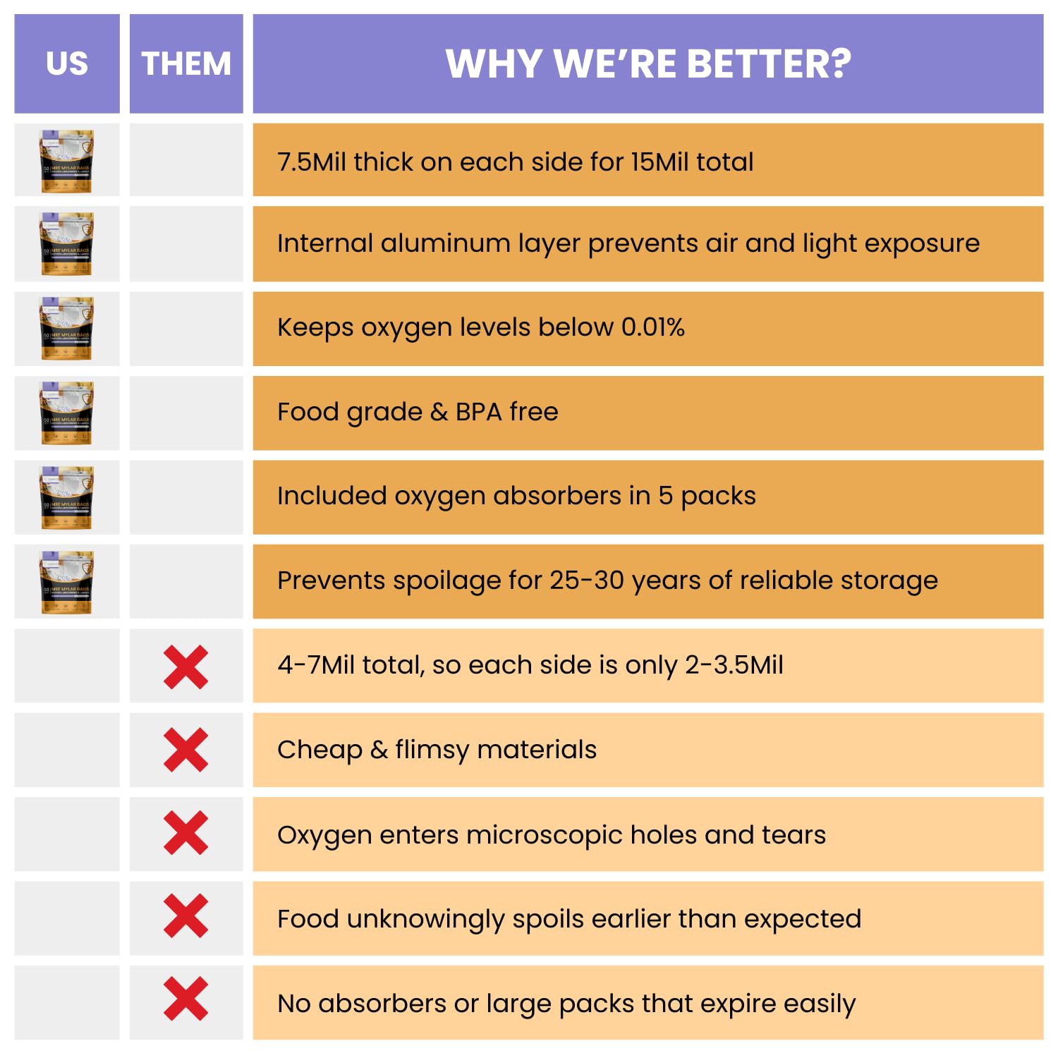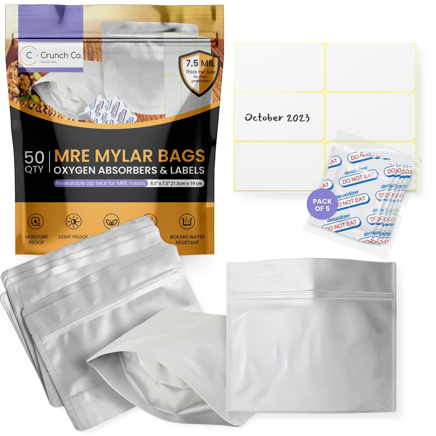 - STORE YOUR OWN SURVIVAL MEALS - Take control of your emergency food supply with our Crunch Co Freeze Dry Mylar bag kit. Assemble and store your homemade survival meals ready-to-eat, avoiding unhealthy additives and the high costs of pre-packaged MRE or survival food kits.